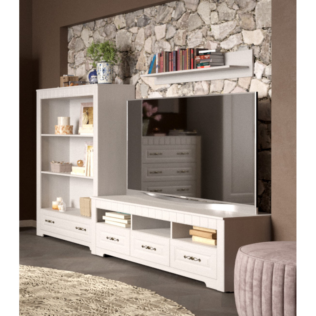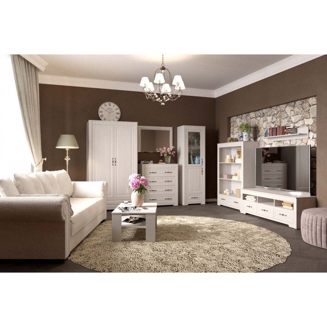 Гостиная Прованс композиция 2 от Мебельград - легкие ноты очарования сельской местности, простота линий и домашний уют - вот основные мотивы мебели этого стиля. На полках Вы сможете разместить свои любимые предметы интерьера, книги, вазы, памятные сувениры, которыми завершите образ гостиной.