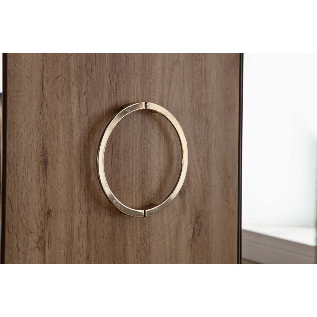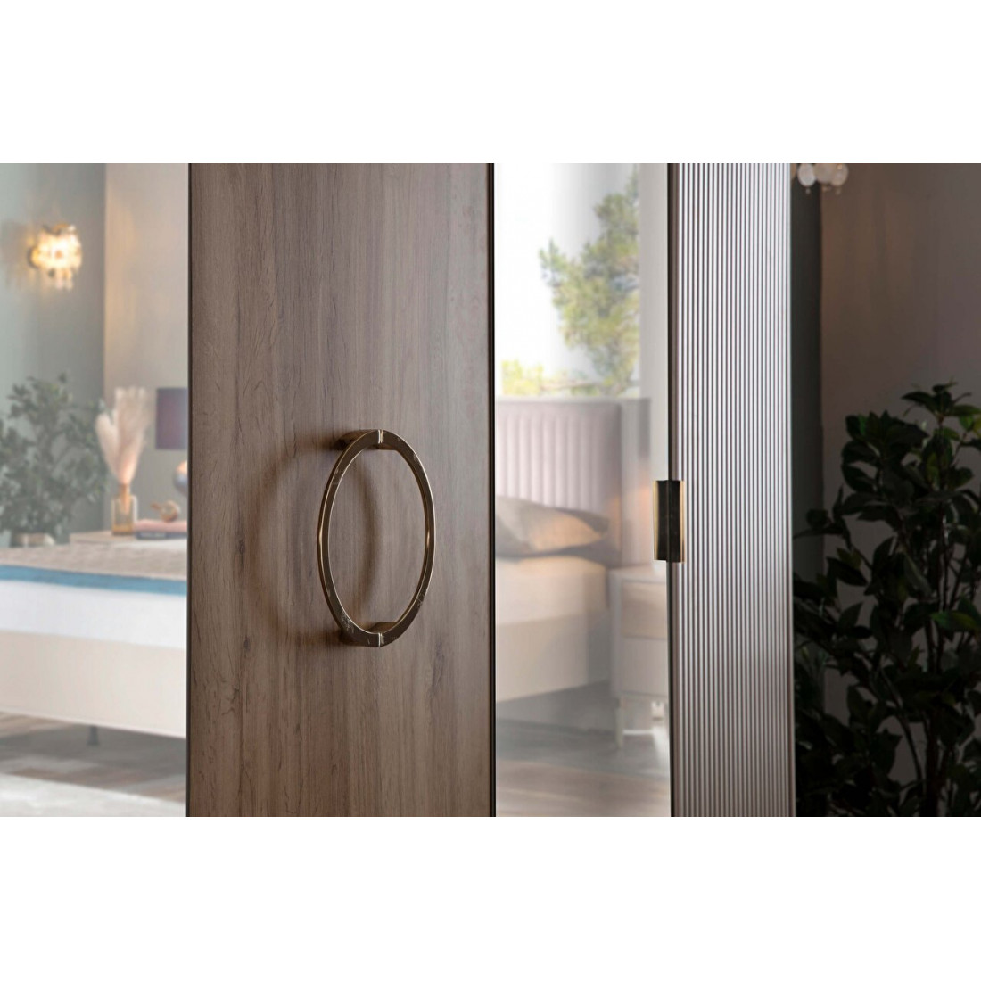 Пятистворчатый шкаф для спальни Санвито SANV-33 от турецкого бренда Bellona длиною 2260мм впечатляет своим дизайном и вместительностью.Наполнение шкафа предусматривает три отделения, каждое из которых позволяет удобно разместить предметы гардероба в нужном порядке. Шкаф изначально комплектуется множеством полок, штанг, а так же выдвижными ящиками. Особое внимание уделено дизайну шкафчика. Пять дверок комбинируются между собой. Крайние дверки фасада с рифленой поверхностью в цвете крем дополнены скругленными вставками с торца шкафа. Центральная дверь из древесного ЛДСП украшена круглой золотистой ручкой. Два зеркала во всю обрамляют центральную часть шкафа.