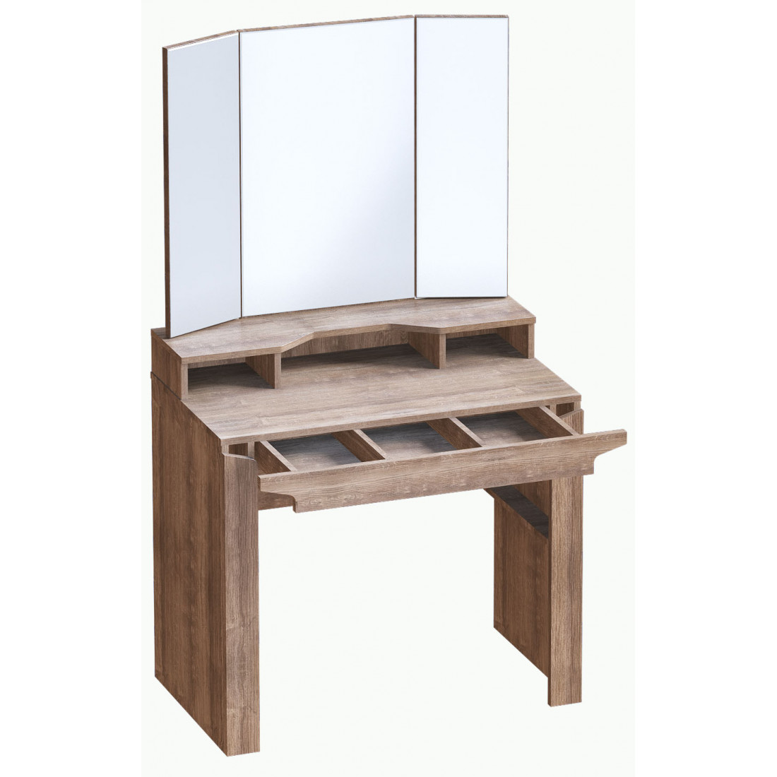 Туалетный столик с зеркалом из коллекции Соренто Дуб стирлинг порадует ценителей лаконичных форм своими простыми, современными линиями и приятной светлой деревянной текстурой,создающей чувство покоя и комфорта в вашем доме. Удобная рабочая поверхность с дополнительной надстройкой позволит держать необходимые вещи под рукой, а выдвижной ящик служит отличным органайзером для хранения мелочей, косметики, украшений и аксессуаров.
