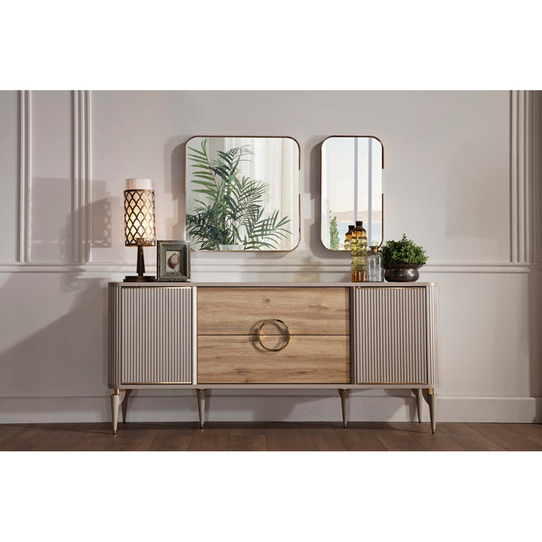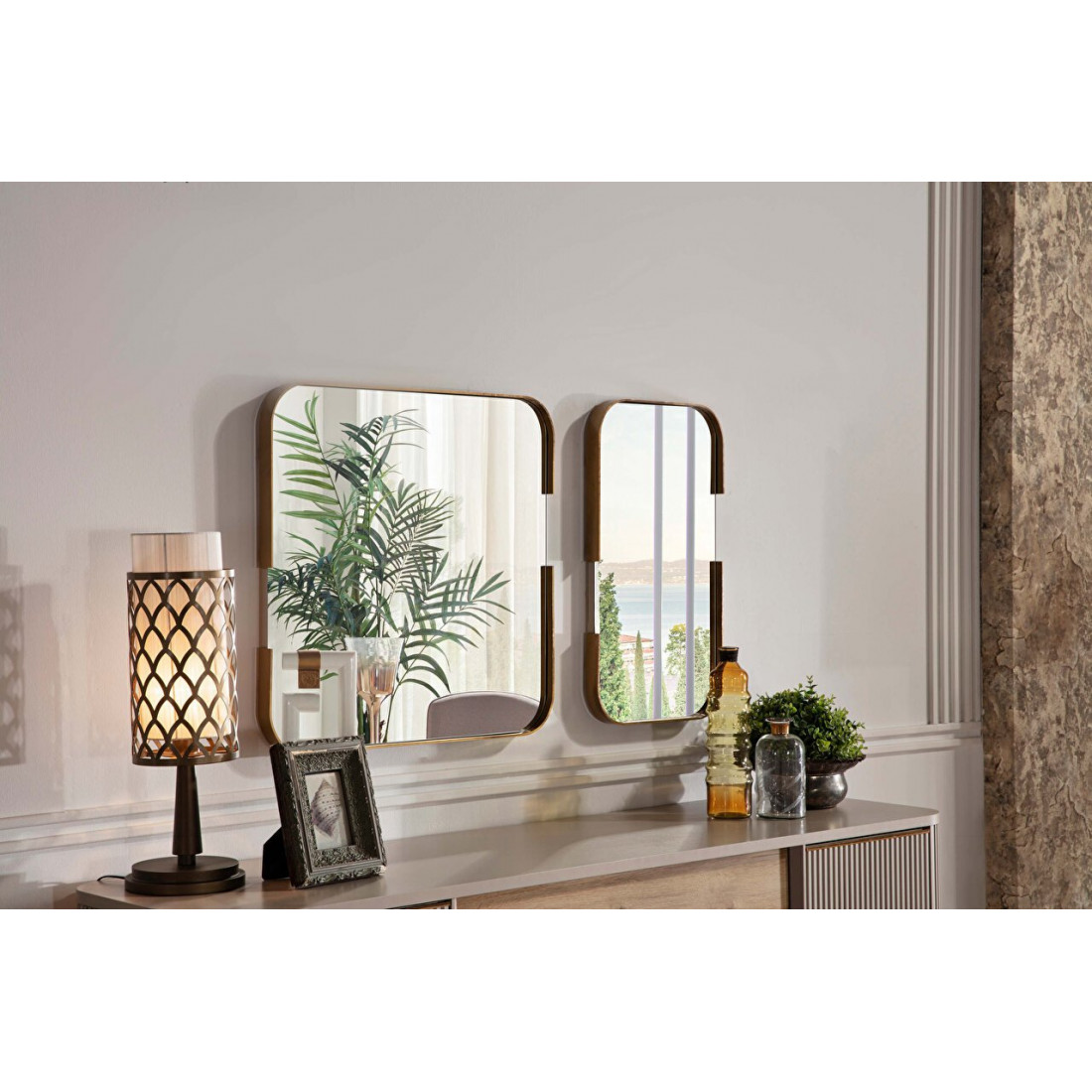 Интересный комплект из 2-х зеркал SANV-11 предлагается к тумбе (комоду, прилавку) турецкой коллекции Санвито SANV-10. Два разных по размеру, но одинаковых по стилю зеркала очень оригинально смотрятся не только в композиции с комодом, но и как отдельный предмет интерьера. Большое зеркало размером 690х690(мм), маленькое -370х690(мм) обрамлены золотистой коемкой.